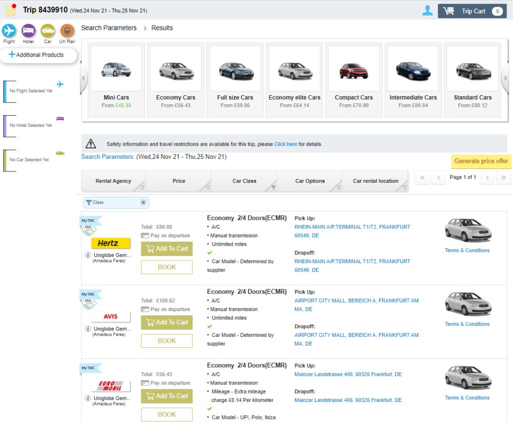 The tool will compare all car hire operators and return the results based on your search criteria and applied filters. Quickly target the size car you need, see your corporate or negotiated rates. Select your car, add to your trip cart then check out when ready. A full credit voucher can be issued to enable invoice payment and negate the need for personal credit cards.