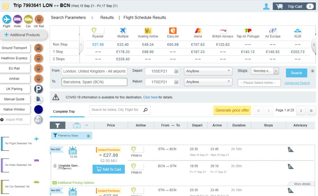 Quickly and easily get to the flights you want by setting the search criteria and subsequent filters. Alternatively compare all flight options from different carriers and near by airports. Mix and match airlines, airports, classes, baggage all in one booking flow. Select your preferred options, add to your basket then check out. Fares are pulled direct from airlines, websites, NDC channels and industry sources Policy guidance and control is always included. Passenger details are taken from profiles, no long forms to complete all done automatically including payment.