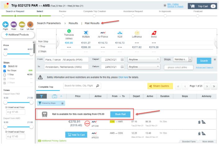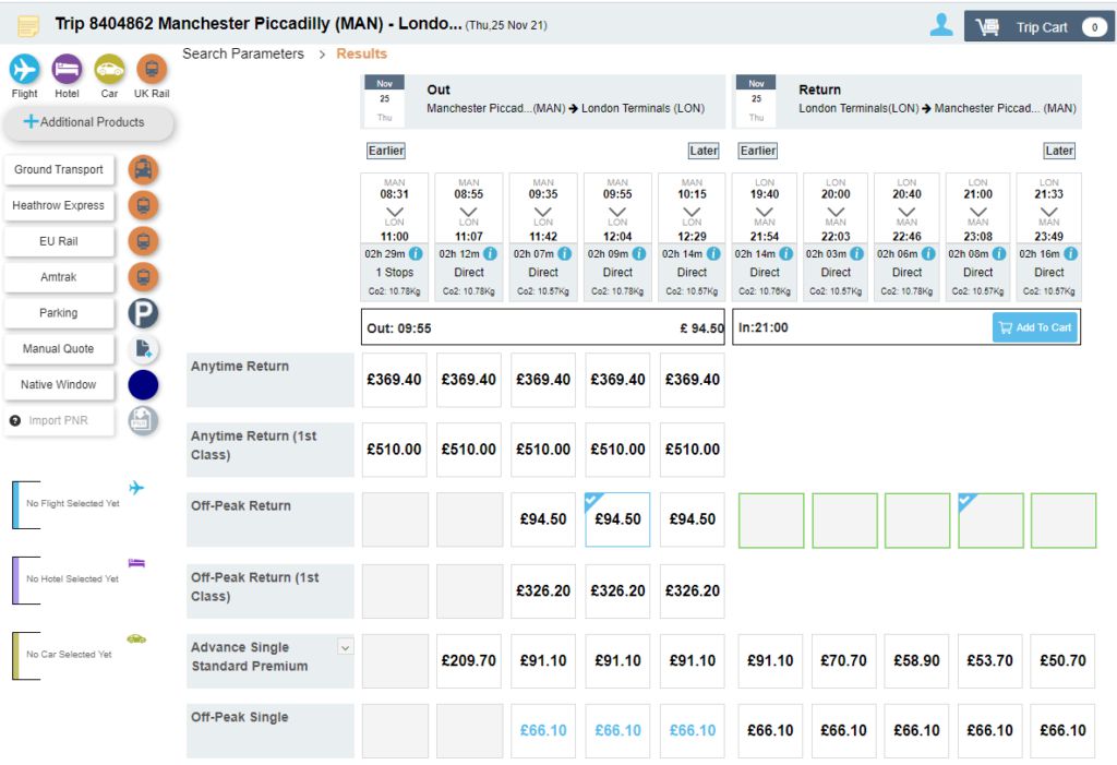Our booking tools enable booking of the entire UK network, substantial coverage of the European rail network, all Eurostar services and Amtrak rail in the USA. The tool allows you to compare flights with rail where available so you can compare price, convenience and sustainability.